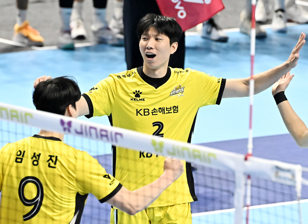 [더발리볼 = 송일섭 기자] KB손해보험 황택의가 25일 오후 인천광역시 계양체육관에서 진행된 '2025-2026 진에서 V리그' 대한항공과 KB손해보험의 경기에서 득점에 환호하고 있다. (사진 = 한국배구연맹 KOVO)