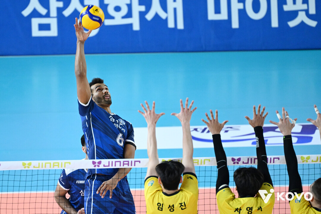 2세트도 삼성화재가 가져갔다. 도산지의 서브가 그대로 코트 안에 떨어졌고 이어 김우진이 임성진의 공격을 가로막으며 27-25로 2세트를 마무리했다.