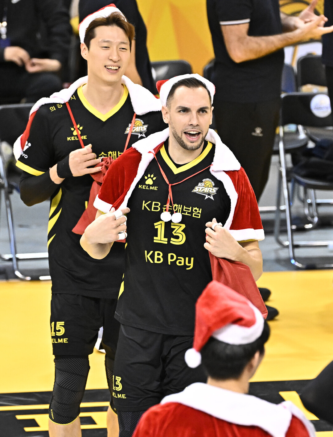 [더발리볼 = 송일섭 기자] KB손해보험 비예나가 25일 오후 경기도 의정부시 경민대학교체육관에서 진행된 '2025-2026 진에서 V리그' KB손해보험과 대한항공의 경기에서 산타복장을 하고 입장하고 있다.