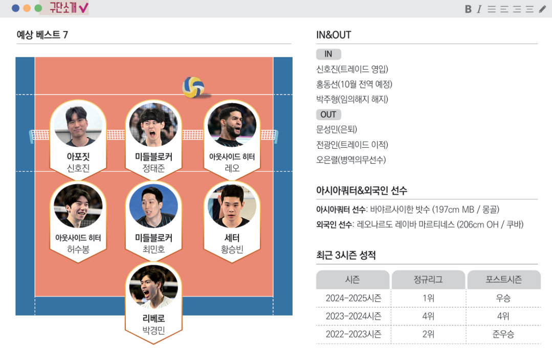 직전 시즌 아웃사이드 히터 레오와 허수봉의 공격 비중이 높았다. 레오는 정규리그 기준 공격 점유율 33.29%를, 허수봉은 27.09%를 가져갔다. 당시 아시아쿼터 선수인 아포짓 신펑이 15.88%를 기록했다. 아포짓의 한방이 아쉬웠다. 허수봉, 레오의 결정력이 더 중요했다. 결국 2025년 블랑 감독이 변화를 꾀했다. 작은 신장이지만 빠른 아포짓 신호진을 트레이드로 영입한 것. 베테랑 아웃사이드 히터 전광인을 OK저축은행에 내줬다. 여기에 아시아쿼터로 미들블로커, 아포짓까지 소화할 수 있는 바야르사이한을 뽑으면서 아포짓 공격력을 강화했다. 좌우는 물론 든든한 중앙까지 다양한 공격 루트를 만들겠다는 뜻이다. 다만 아포짓 선수들의 높이가 낮아졌다. 이 점을 보완해야 하는 과제를 안았다. 두 선수의 영입 효과를 극대화하겠다는 의지를 보이고 있다.