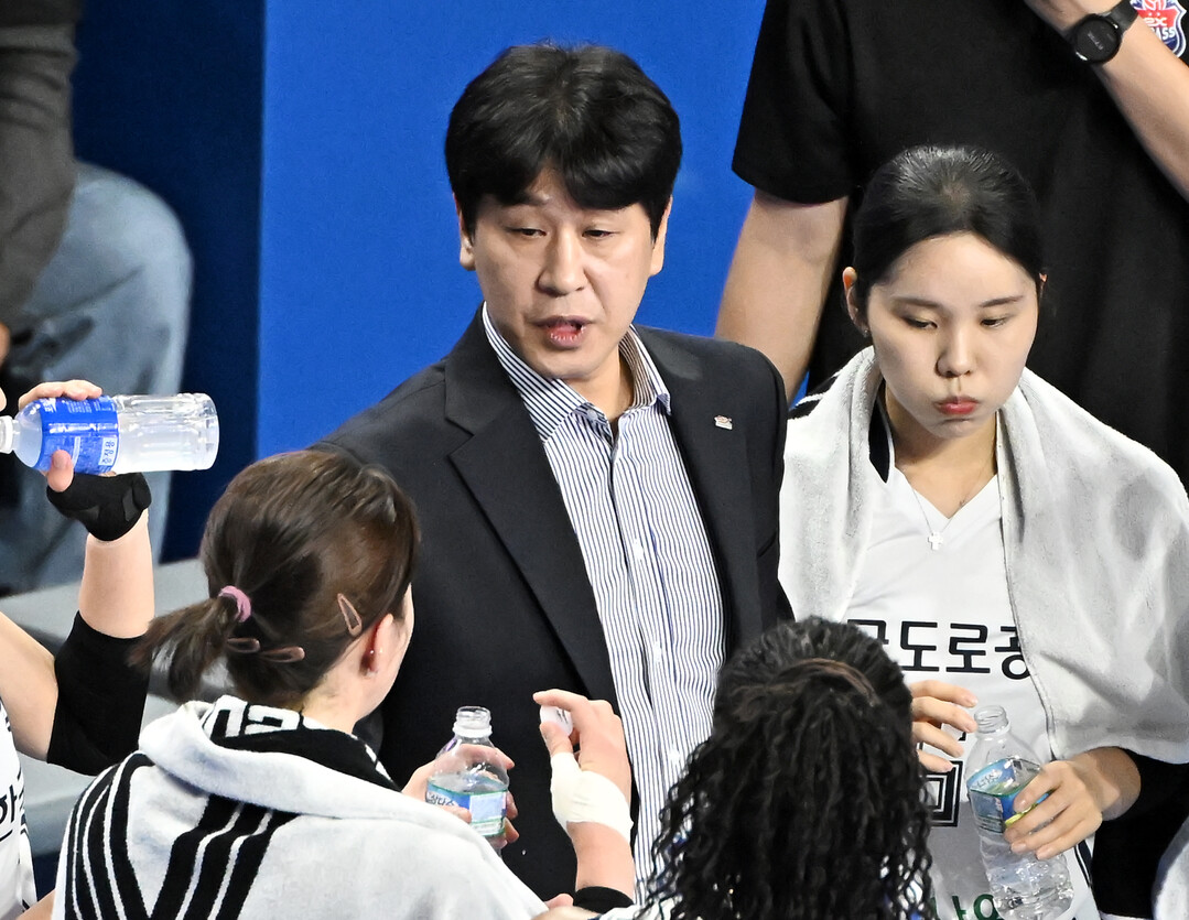 [더발리볼 = 송일섭 기자] 도로공사 김종민 감독이 28일 오후 경기도 화성시 화성실내체육관에서 진행된 '2025-2026 KOVO 프로배구 V리그' 여자부 IBK기업은행과 도로공사의 경기에서 선수들에 지시를 하고 있다.
