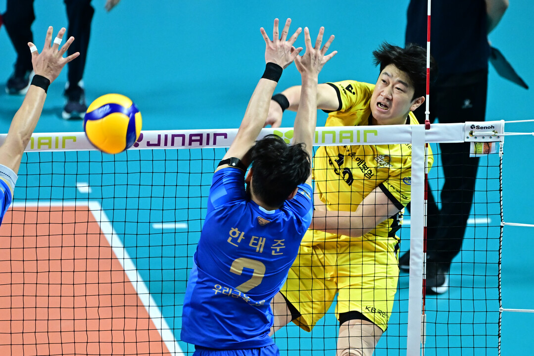 KB손해보험 나경복이 블로킹을 피해 스파이크를 시도하고 있다.