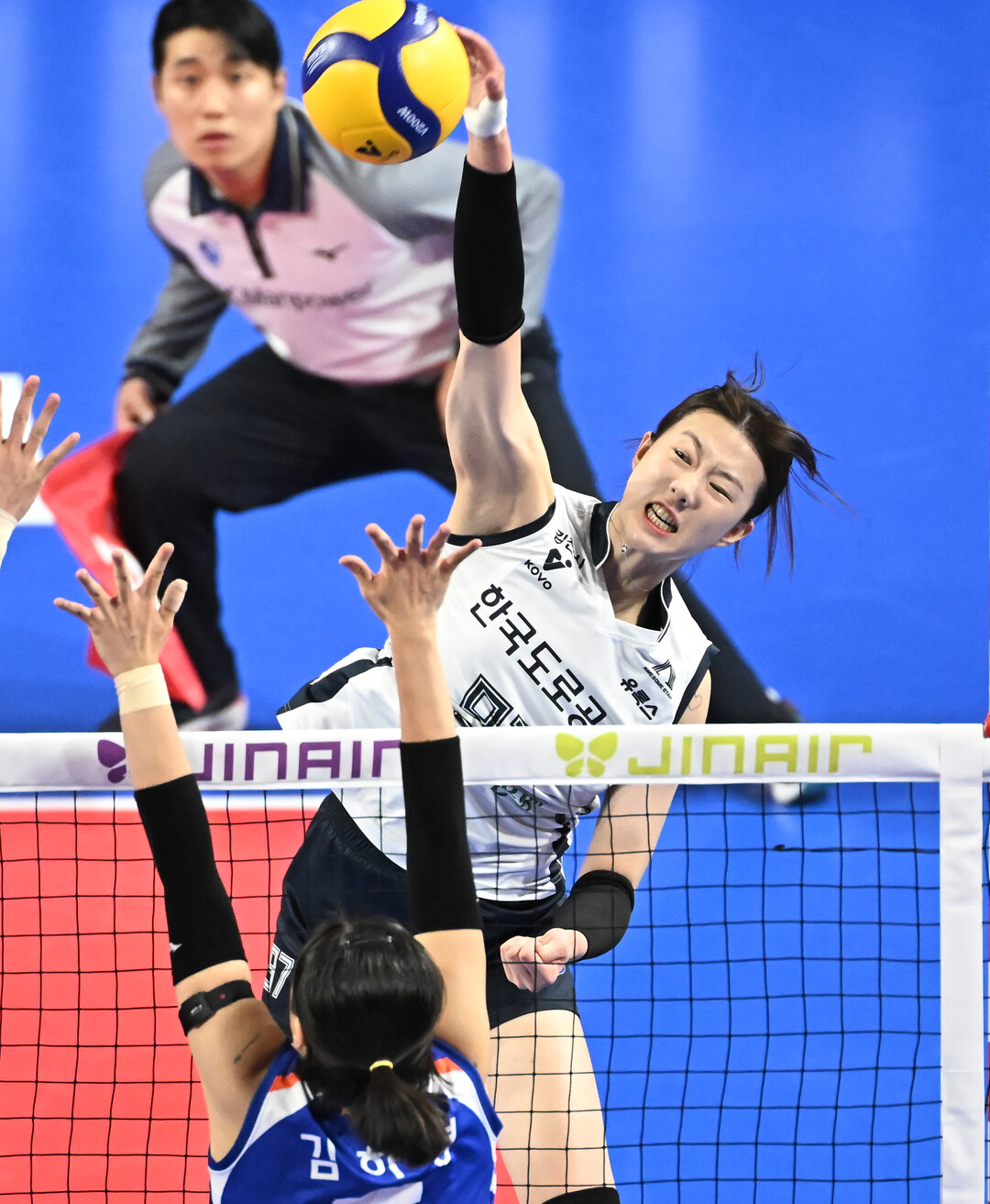 [더발리볼 = 송일섭 기자] 도로공사 강소휘가 28일 오후 경기도 화성시 화성실내체육관에서 진행된 '2025-2026 KOVO 프로배구 V리그' 여자부 IBK기업은행과 도로공사의 경기에서 스파이크를 하고 있다.