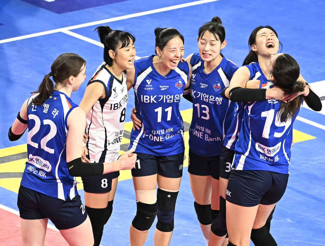 [더발리볼 = 송일섭 기자] 기업은행 선수들이 28일 오후 경기도 화성시 화성실내체육관에서 진행된 '2025-2026 KOVO 프로배구 V리그' 여자부 IBK기업은행과 도로공사의 경기에서 득점에 환호하고 있다.