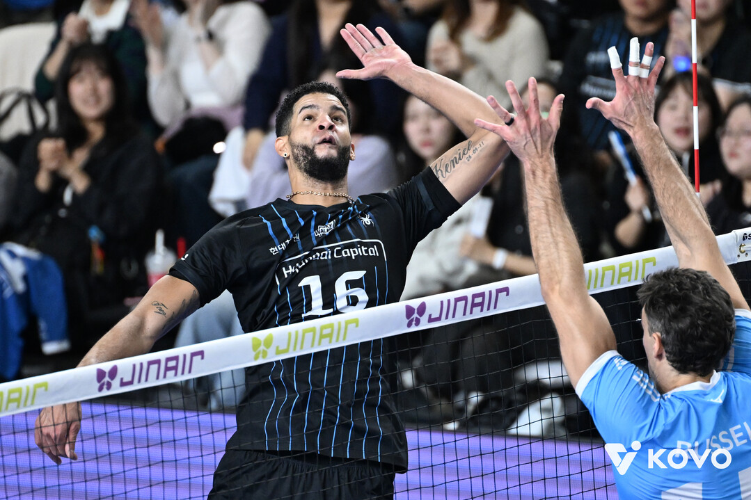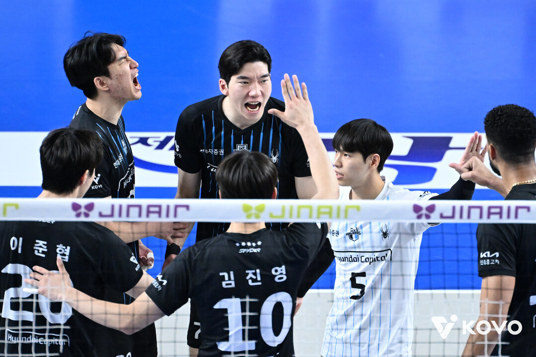 현대캐피탈은 최민호가 정지석의 중앙 파이프를 잡아낸 뒤 대한항공의 연속 공격 범실로 3세트를 가져갔다.