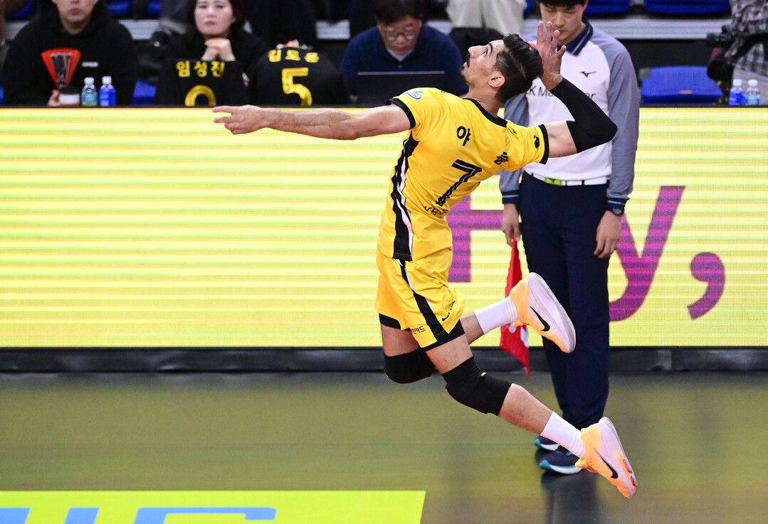 [더발리볼 = 유진형 기자] KB손해보험 야쿱이 18일 오후 부산강서실내체육관에서 열린 '진에어 2025~2026 V-리그' OK저축은행과의 경기에서 서브를 넣고 있다.