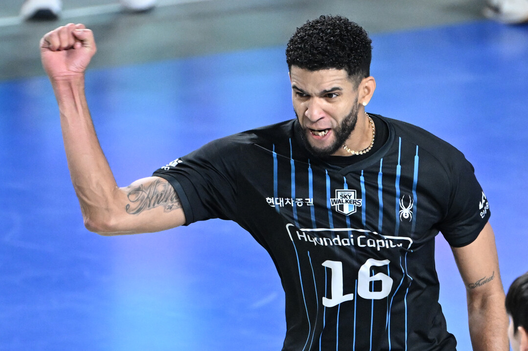 현대캐피탈 레오가 서브에이스에 기뻐하고 있다.