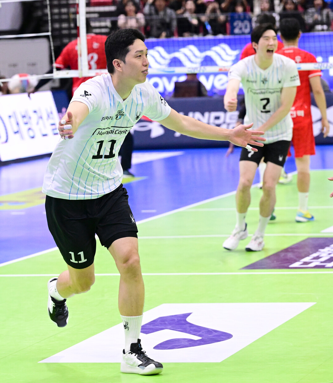 [더발리볼 = 유진형 기자] 현대캐피탈 최민호가 29일 오후 경기도 수원실내체육관에서 열린 '진에어 2025~2026 V-리그' 한국전력과의 경기에서 기뻐하고 있다.