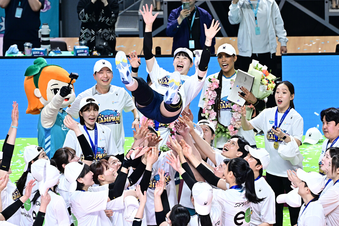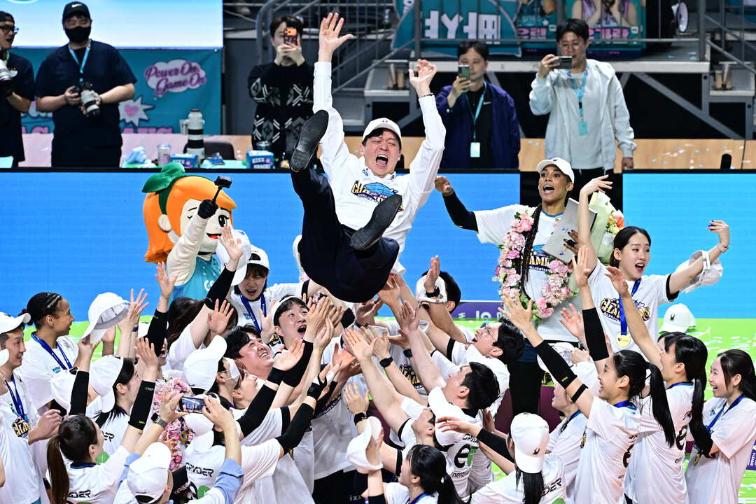 ▲ 5일 서울 장충체육관에서 열린 진에어 2025~2026 V-리그 여자부 챔피언결정전 3차전 GS칼텍스-한국도로공사 경기. GS칼텍스의 우승 확정 후 선수들이 이영택 감독을 헹가래 하고 있다.