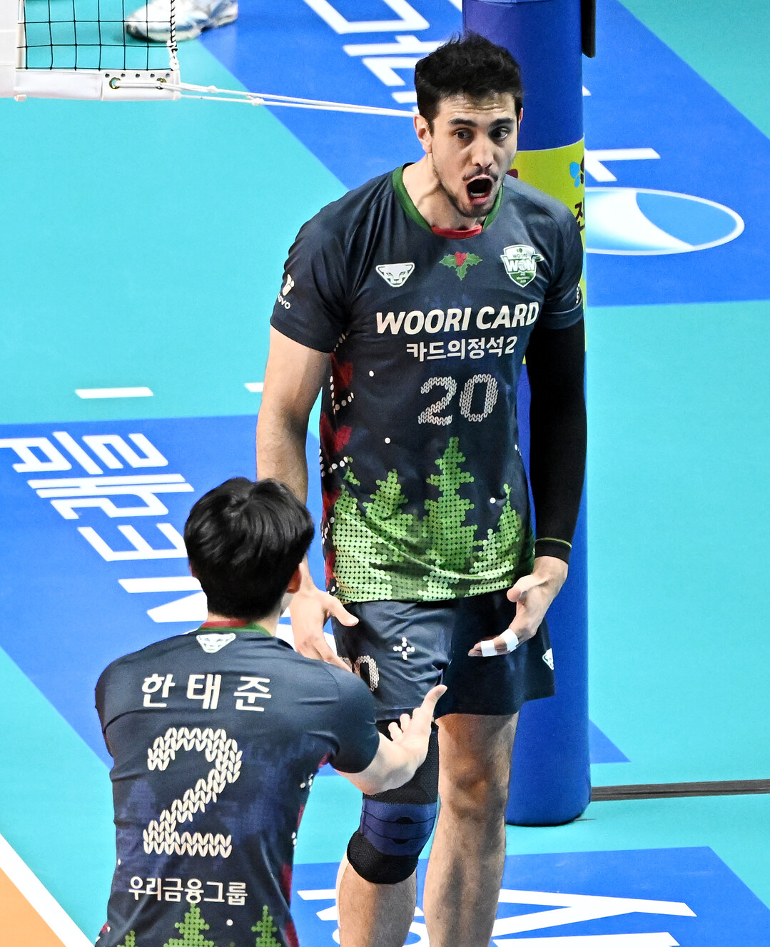[더발리볼 = 송일섭 기자] 우리카드 아라우조가 28일 오후 서울 장충체육관에서 진행된 '2025-2026 진에서 V리그' 우리카드와 대한항공의 경기에서 블로킹을 성공한 뒤 포효하고 있다.