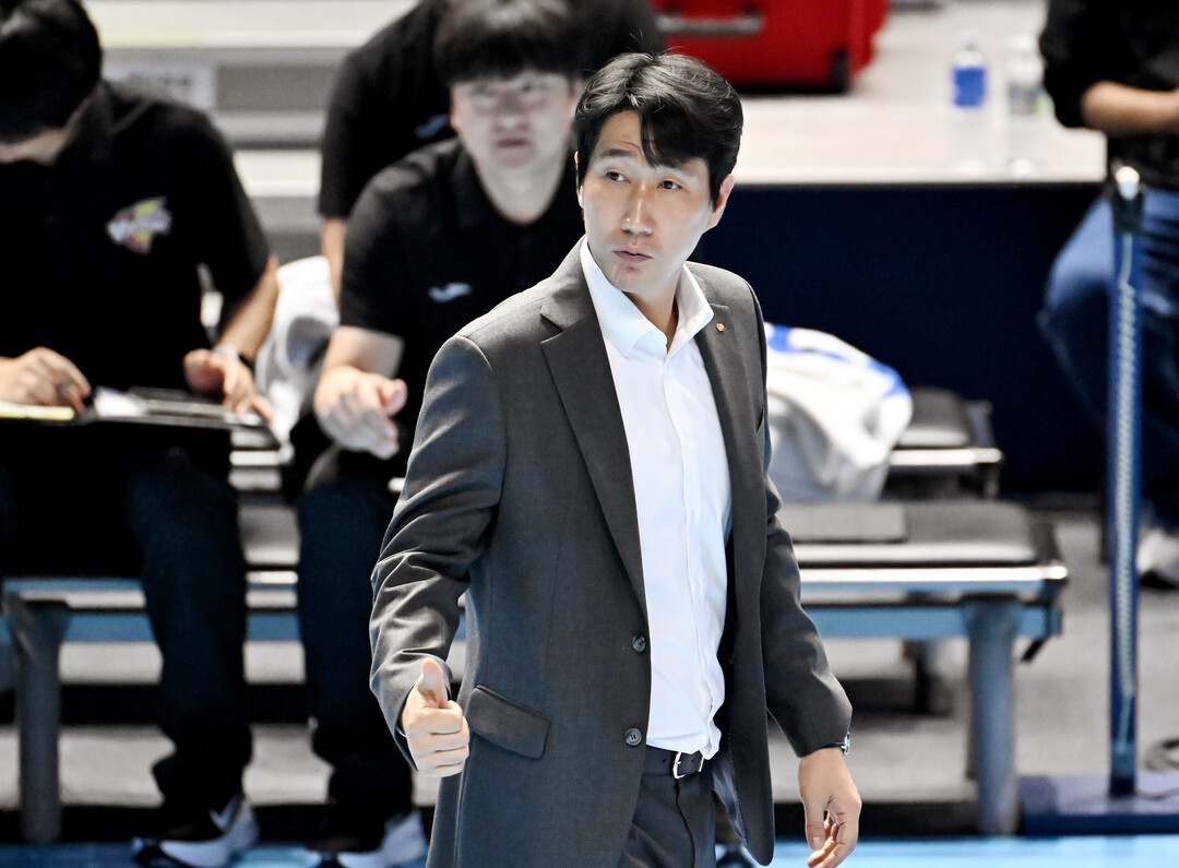 [더발리볼 = 송일섭 기자] 한국전력 권영민 감독이 23일 오후 인천광역시 계양구 계양체육관에서 진행된 '2025-2026 KOVO 진에어 V리그' 남자부 대한항공과 한국전력의 경기에서 선수들에게 지시를 하고 있다. [사진 = 한국배구연맹(KOVO)]