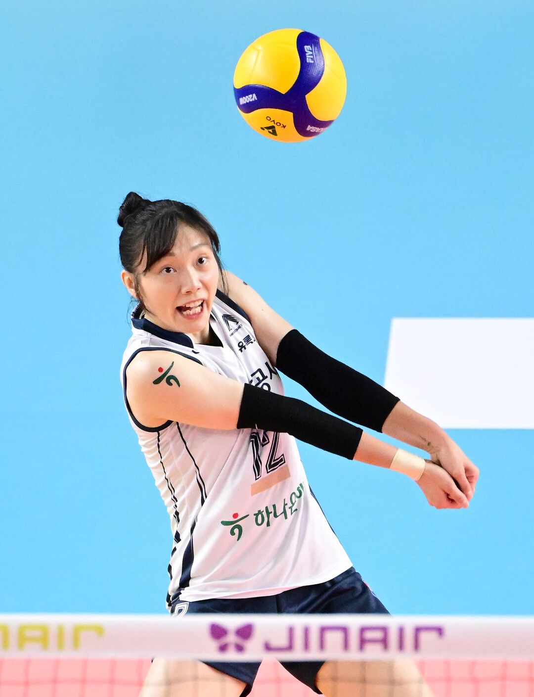 [더발리볼 = 유진형 기자] 한국도로공사 문정원이 25일 오후 경상북도 김천실내체육관에서 열린 '진에어 2025~2026 V-리그' 흥국생명과의 경기에서 리시브를 하고 있다.