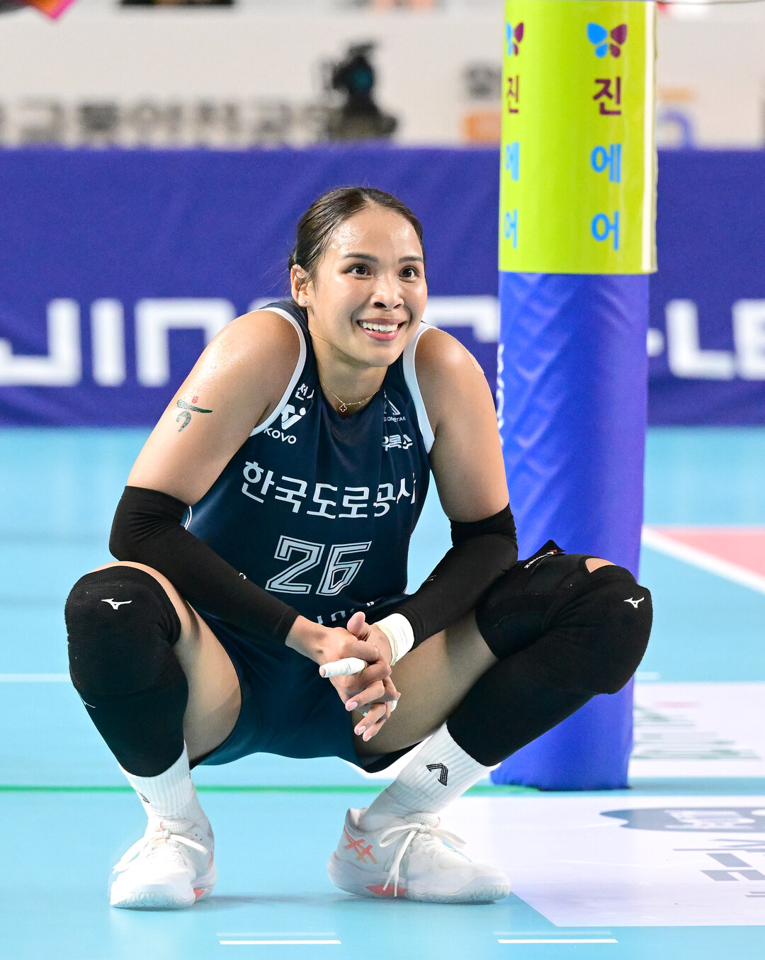 [더발리볼 = 유진형 기자] 한국도로공사 타나차가 25일 오후 경상북도 김천실내체육관에서 열린 '진에어 2025~2026 V-리그' 흥국생명과의 경기에서 허탈한 미소를 짓고 있다.