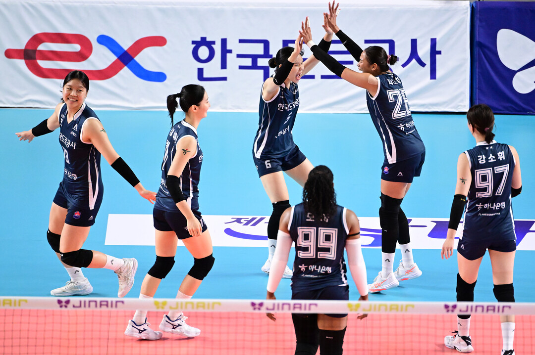 [더발리볼 = 유진형 기자] 한국도로공사가 25일 오후 경상북도 김천실내체육관에서 열린 '진에어 2025~2026 V-리그' 흥국생명과의 경기에서 기뻐하고 있다.