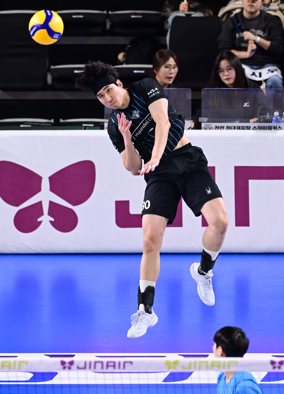 [더발리볼 = 유진형 기자] 현대캐피탈 신호진이 7일 오후 충청남도 천안시 유관순체육관에서 열린 '진에어 2025~2026 V-리그' 우리카드와의 경기에서 서브를 넣고 있다.