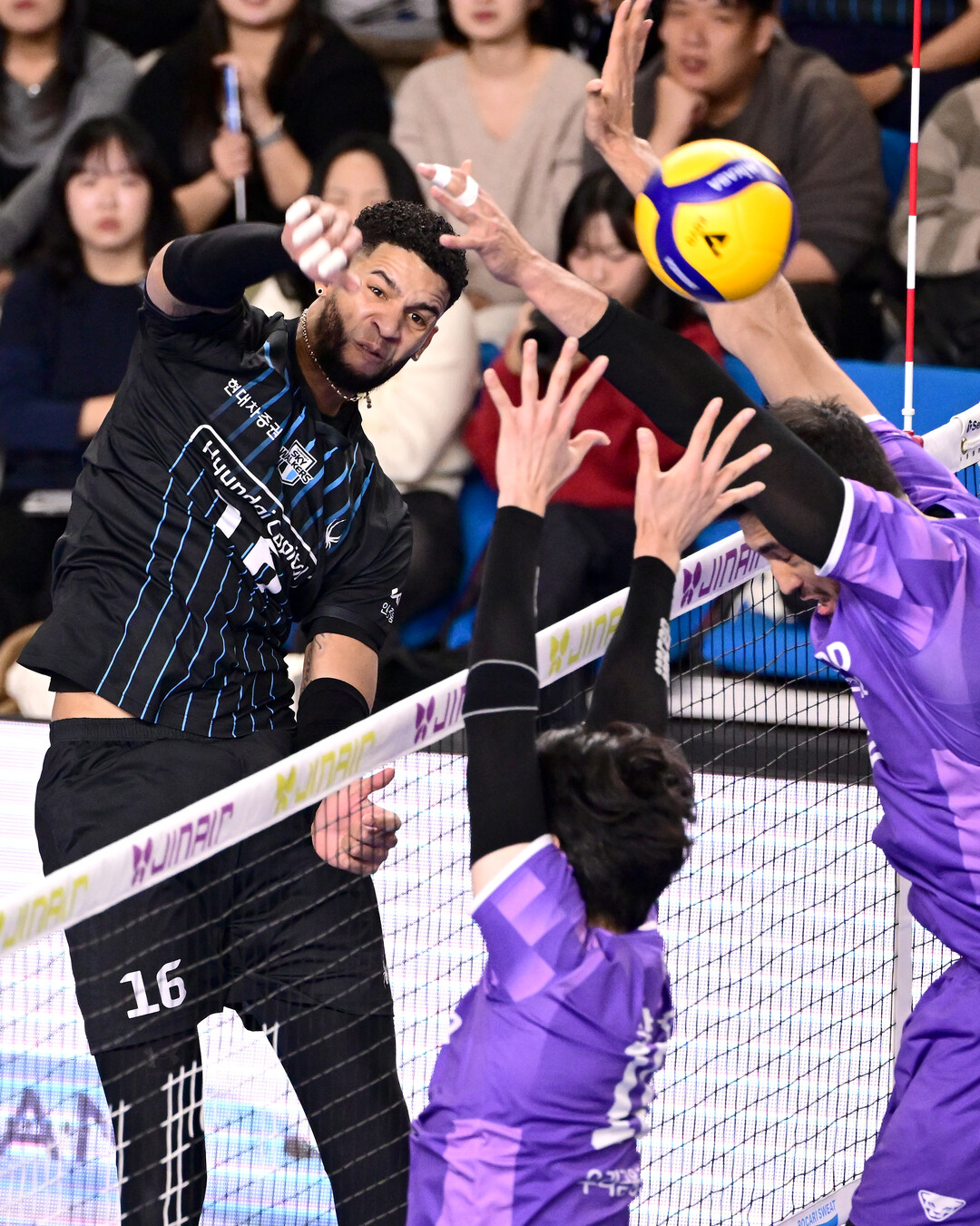 [더발리볼 = 유진형 기자] 현대캐피탈 레오가 7일 오후 충청남도 천안시 유관순체육관에서 열린 '진에어 2025~2026 V-리그' 우리카드와의 경기에서 스파이크를 때리고 있다.