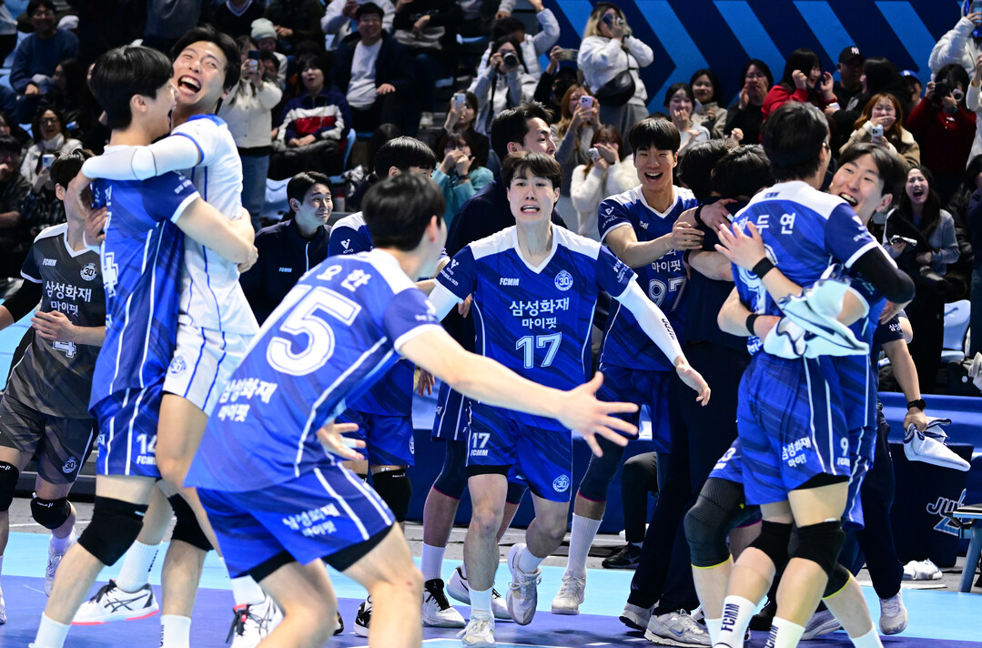 [더발리볼 = 유진형 기자] 삼성화재가 1일 오후 인천 계양실내체육관에서 열린 '진에어 2025~2026 V-리그' 대한항공과의 경기에서 승리한 뒤 기뻐하고 있다.