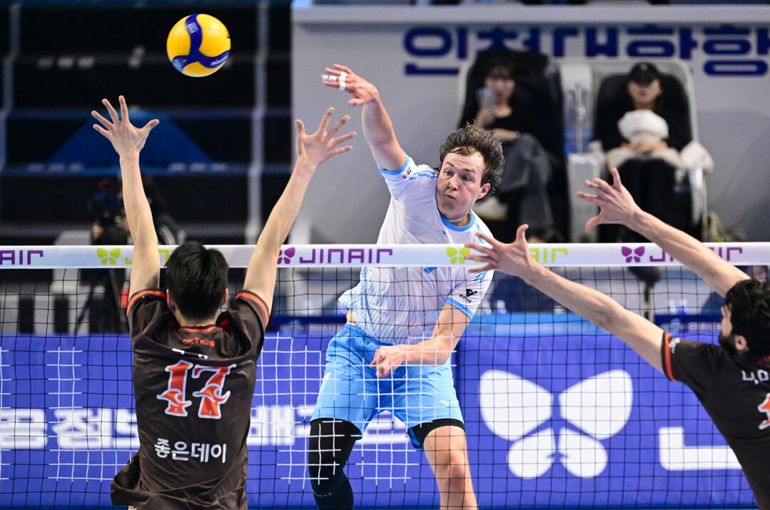 [더발리볼 = 유진형 기자] 대한항공 이든이 18일 오후 인천 계양체육관에서 열린 '진에어 2025~2026 V-리그' OK저축은행과의 경기에서 스파이크를 하고 있다.