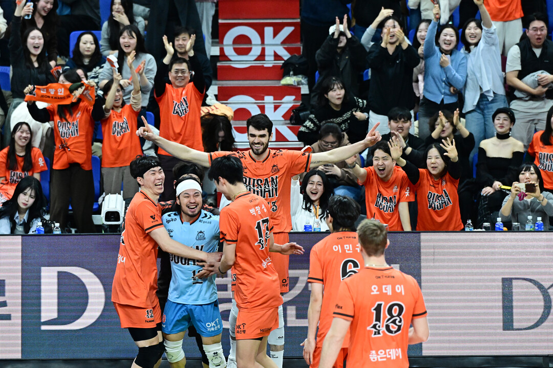 [더발리볼 = 한혁승 기자] 4일 부산 강서체육관에서 열린 진에어 2025~2026 V-리그 남자부 OK저축은행-KB손해보험 경기.