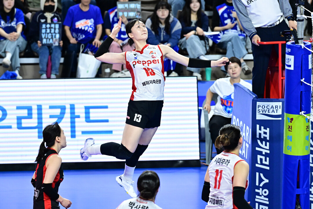 [더발리볼 = 한혁승 기자] 15일 경기도 화성실내체육관에서 열린 진에어 2025~2026 V-리그 여자부 IBK기업은행-페퍼저축은행 경기.