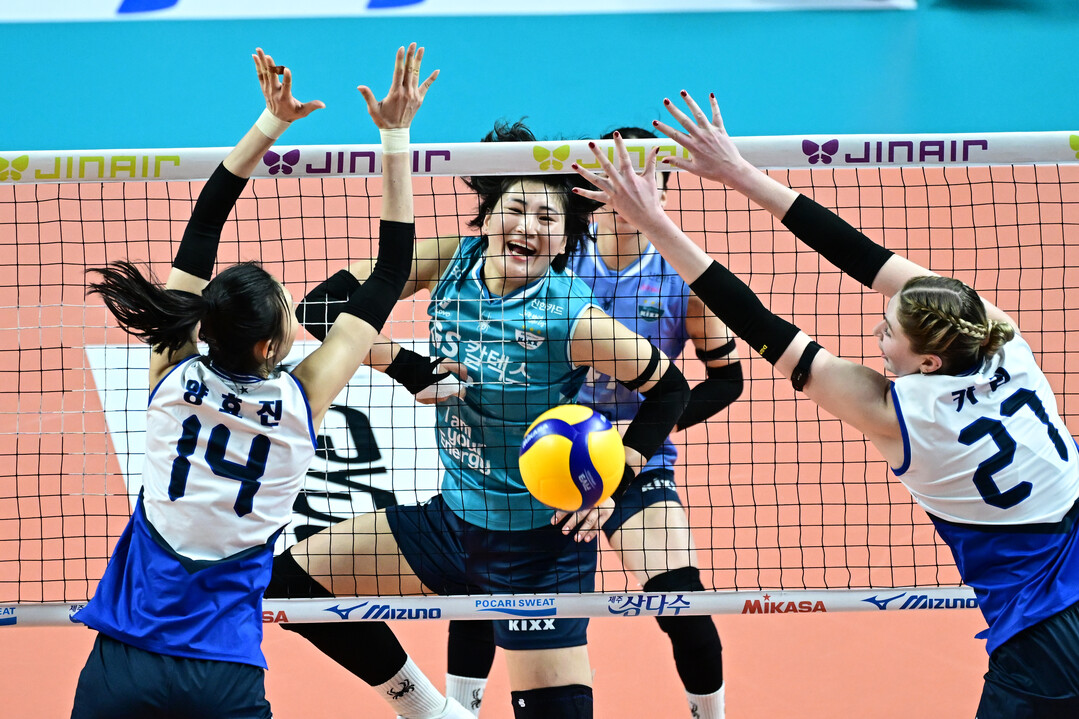 GS칼텍스 최가은이 현대건설 양효진과 카리 사이에 공격을 성공시키고 있다.