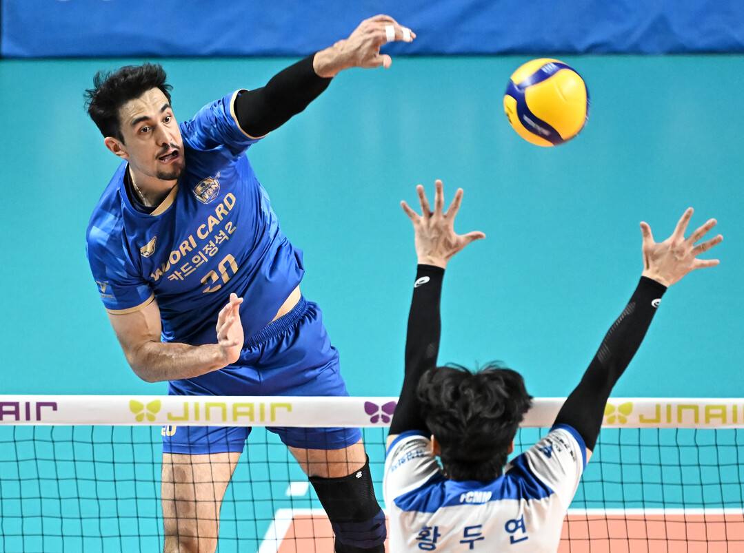 [더발리볼 = 송일섭 기자] 우리카드 아라우조가 19일 오후 서울 장충체육관에서 진행된 '2025-2026 진에서 V리그' 우리카드와 삼성화재의 경기에서 스파이크를 하고 있다. (사진 = 한국배구연맹 KOVO)