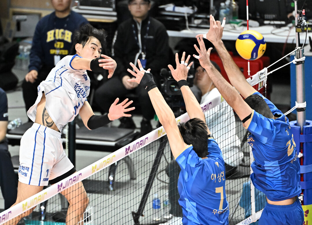 [더발리볼 = 송일섭 기자] 삼성화재 김우진이 19일 오후 서울 장충체육관에서 진행된 '2025-2026 진에서 V리그' 우리카드와 삼성화재의 경기에서 스파이크를 하고 있다. (사진 = 한국배구연맹 KOVO)