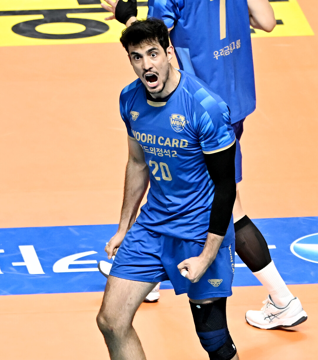 [더발리볼 = 송일섭 기자] 우리카드 아라우조가 19일 오후 서울 장충체육관에서 진행된 '2025-2026 진에서 V리그' 우리카드와 삼성화재의 경기에서 득점에 환호하고 있다. (사진 = 한국배구연맹 KOVO)