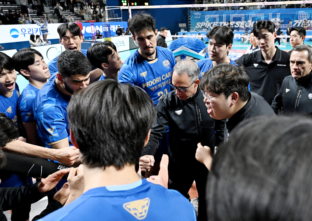 [더발리볼 = 송일섭 기자] 우리카드 선수들이 19일 오후 서울 장충체육관에서 진행된 '2025-2026 진에서 V리그' 우리카드와 삼성화재의 경기에서 승리에 환호하고 있다. (사진 = 한국배구연맹 KOVO)