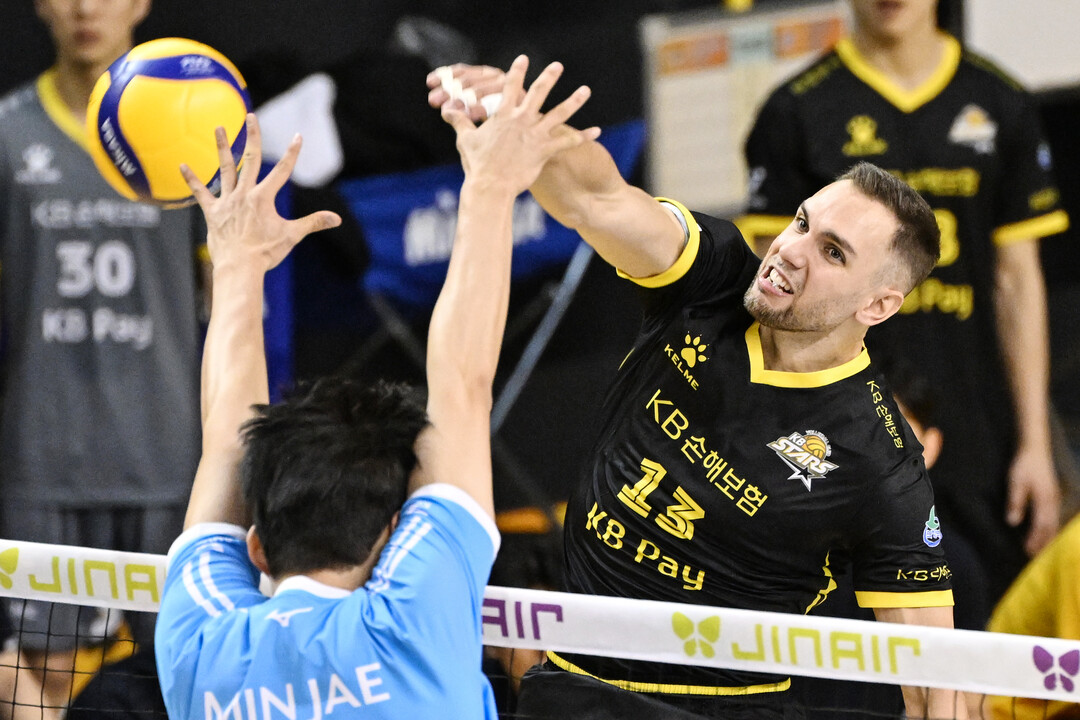 KB손해보험 비예나가 블로킹을 피해 스파이크를 하고 있다.