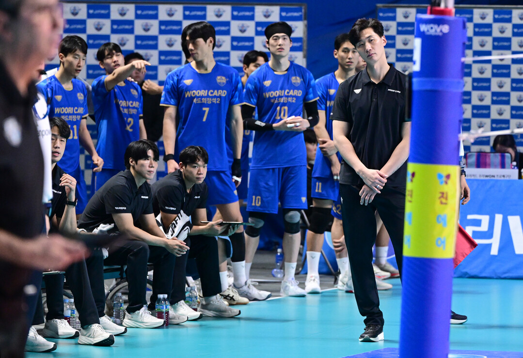 [더발리볼 = 유진형 기자] 우리카드 박철우 감독대행이 18일 오후 서울 장충체육관에서 열린 '진에어 2025~2026 V-리그' 현대캐피탈과의 경기에서 패한 뒤 아쉬워하고 있다.