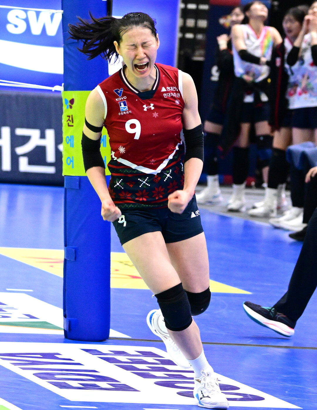 [더발리볼 = 유진형 기자] 현대건설 나현수가 25일 오후 경기도 수원실내체육관에서 열린 '진에어 2025~2026 V-리그' 정관장과의 경기에서 승리한 뒤 포효하고 있다.