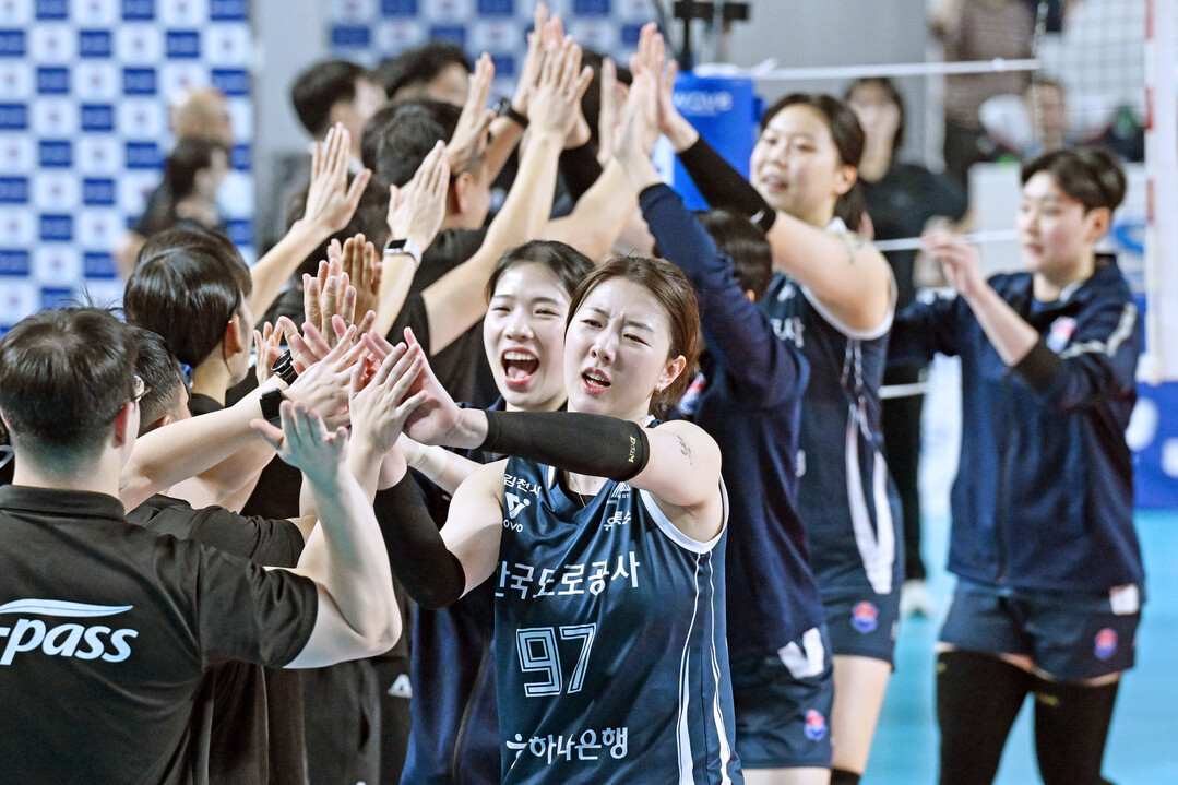 한국도로공사가 승리로 7연승을 기록하며 기뻐하고 있다.