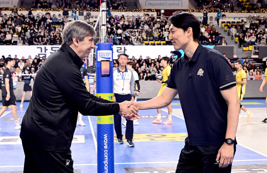 [더발리볼 = 유진형 기자] 현대캐피탈 필립 블랑 감독과 KB손해보험 하현용 감독대행이 31일 오후 천안 유관순체육관에서 열린 '진에어 2025~2026 V-리그' 현대캐피탈과 KB손해보험과의 경기에서 인사하고 있다.