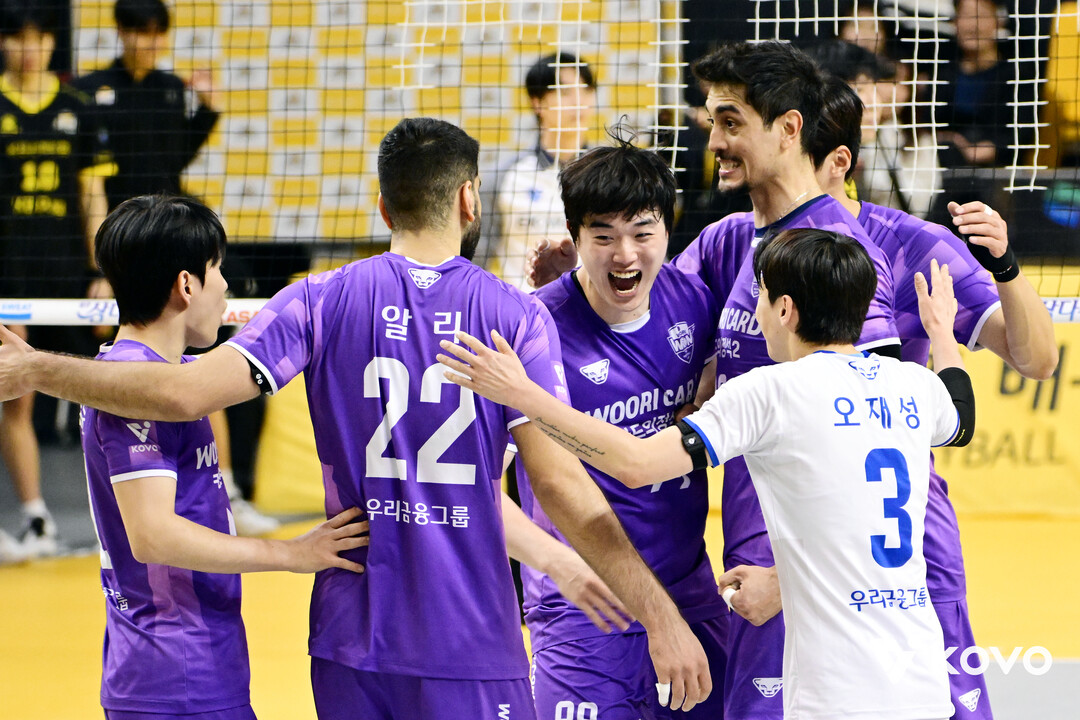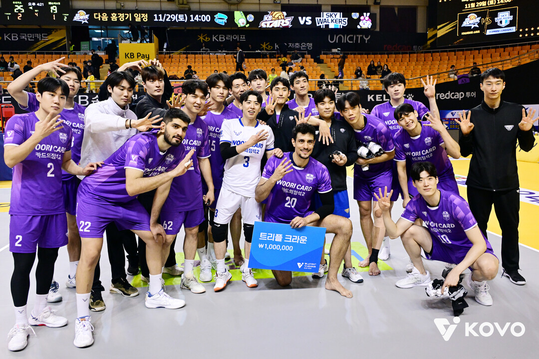 우리카드는 22일 오후 경민대학교 기념관에서 열린 진에어 2025~2026 V-리그 2라운드 KB손해보험 원정 경기에서 3-1(25-22, 25-22, 20-25, 25-19) 승리를 거뒀다. 이번 시즌 홈경기에서 모두 이겼던 KB손해보험의 ‘경민불패’를 깼다.