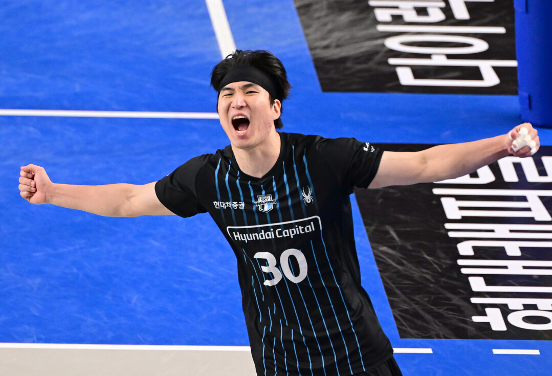 [더발리볼 = 유진형 기자] 현대캐피탈 신호진이 31일 오후 천안 유관순체육관에서 열린 '진에어 2025~2026 V-리그' KB손해보험과의 경기에서 기뻐하고 있다.