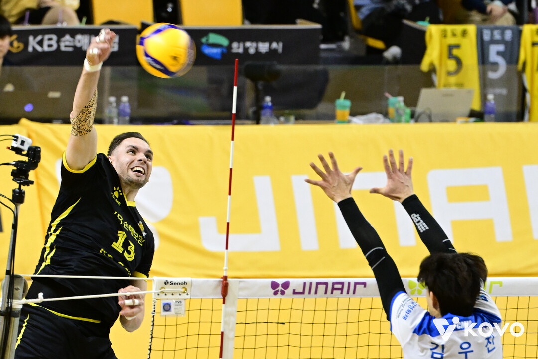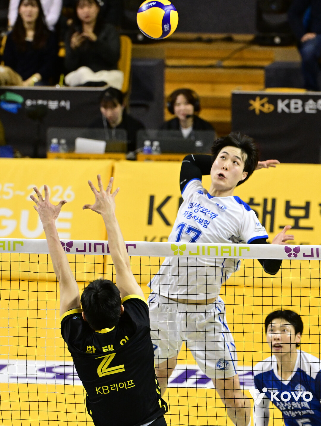KB손해보험은 24일 오후 7시 경민대학교 기념관에서 펼쳐진 삼성화재와 ‘진에어 2025-2026 V-리그’ 6라운드에서 세트 스코어 3-1(25-20, 18-25, 25-16, 25-23)로 승리했다.