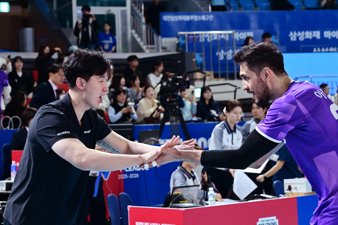 [더발리볼 = 대전 곽경훈 기자] 우리카드 박철우 감독대행이 17일 대전 충무체육관에서 진행된 ' 진에어 2025~2026 V리그' 삼성화재의 경기에서 세트 스코어 3-0(25-23, 25-22, 25-17)으로 승리한 뒤 아라우조와 하이파이브를 하고 ㅇ잇다.