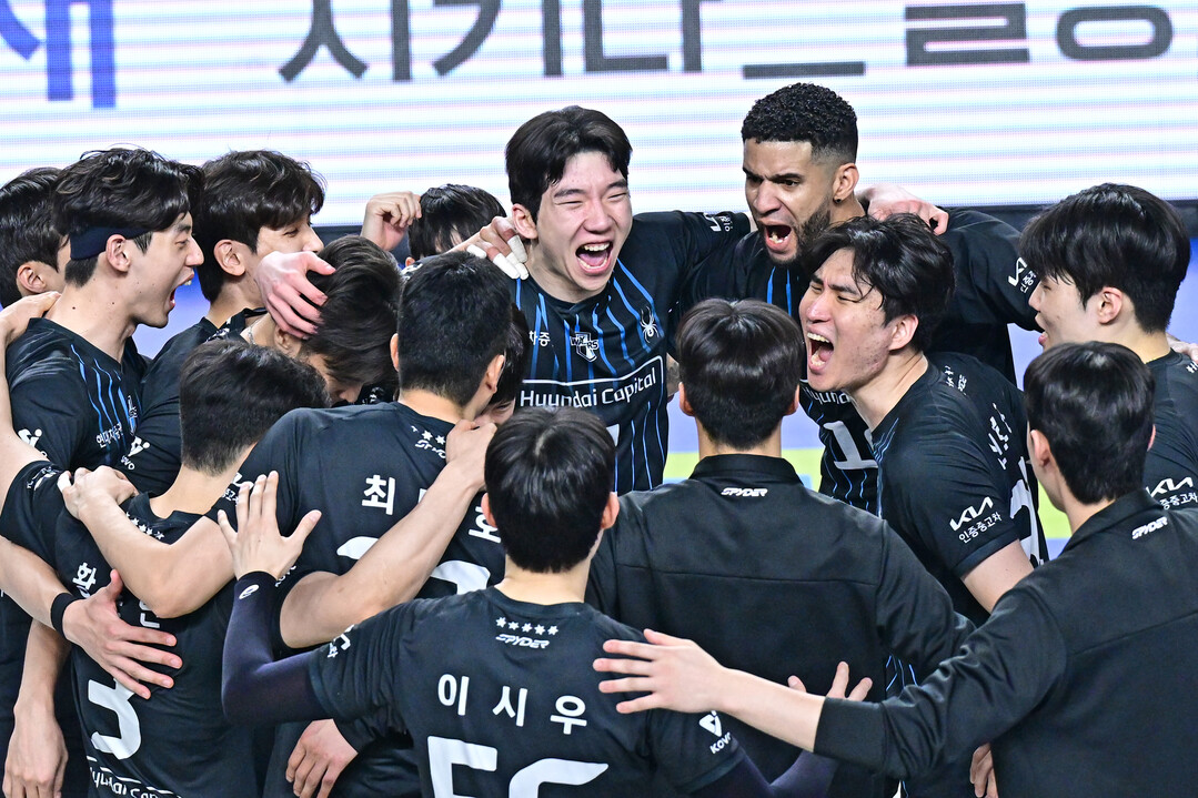현대캐피탈 선수들이 3-2로 우리카드에 리버스 스윕 승리 후 기뻐하고 있다.
