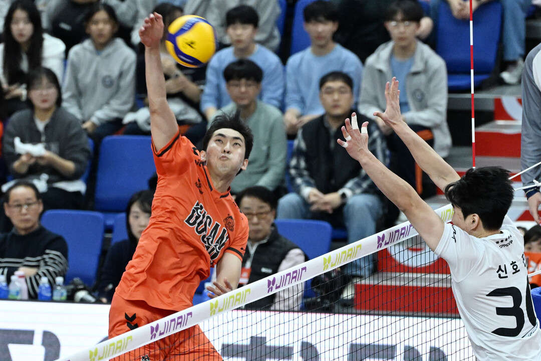 OK저축은행 차지환이 스파이크를 하고 있다.