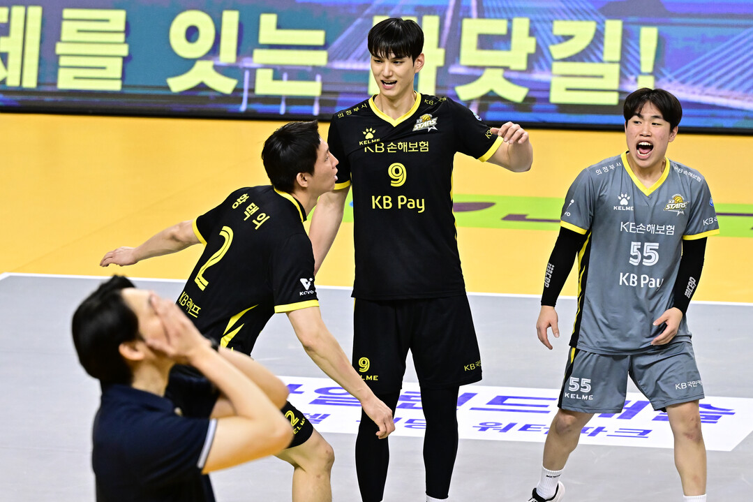 KB손해보험 황택의가 서브 에이스로 5세트 마지막 득점을 성공시켰다. 기뻐하는 동료와 감독.