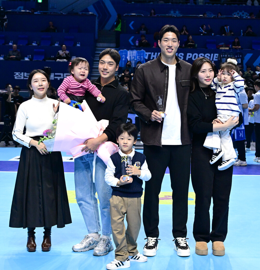 [더발리볼 = 유진형 기자] 정성민과 이수황이 21일 오후 인천 계양체육관에서 열린 '진에어 2025~2026 V-리그' OK저축은행과의 경기에서 은퇴식을 하고 있다.