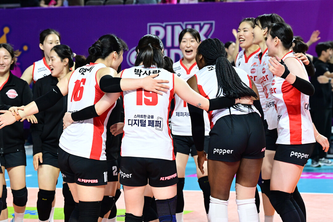 [더발리볼 = 인천 곽경훈 기자] 페퍼저축은행 2일 오후 인천삼산월드체육관에서 열린 진에어 2025-2026 V-리그 여자부 1라운드 흥국생명과의 경기에서 세트 스코어 3-0으로 승리한 뒤 기뻐하고 있다. [사진 = 한국배구연맹(KOVO)]