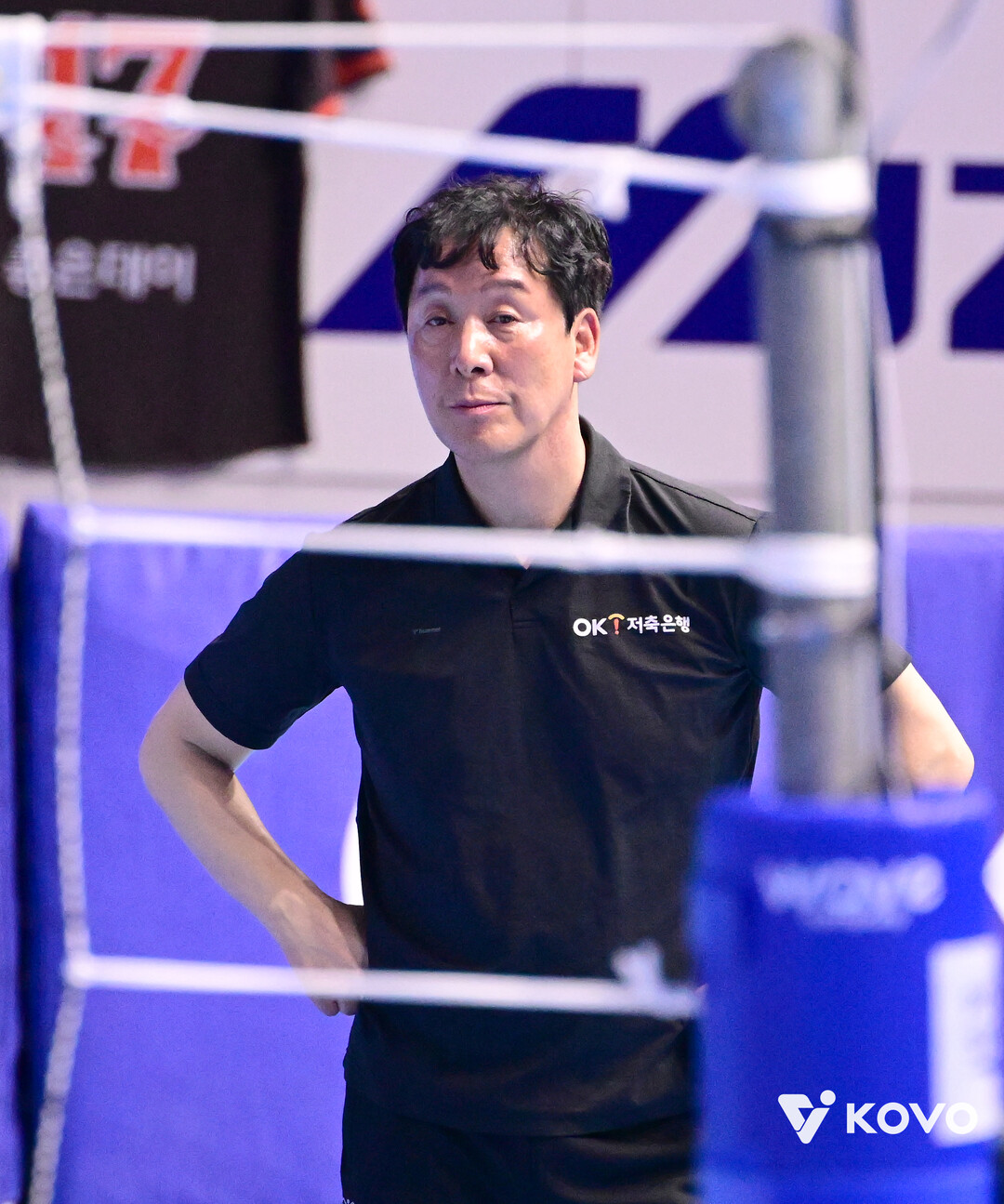 OK저축은행 신영철 감독의 V-리그 최초 300승 달성이 미뤄졌다.