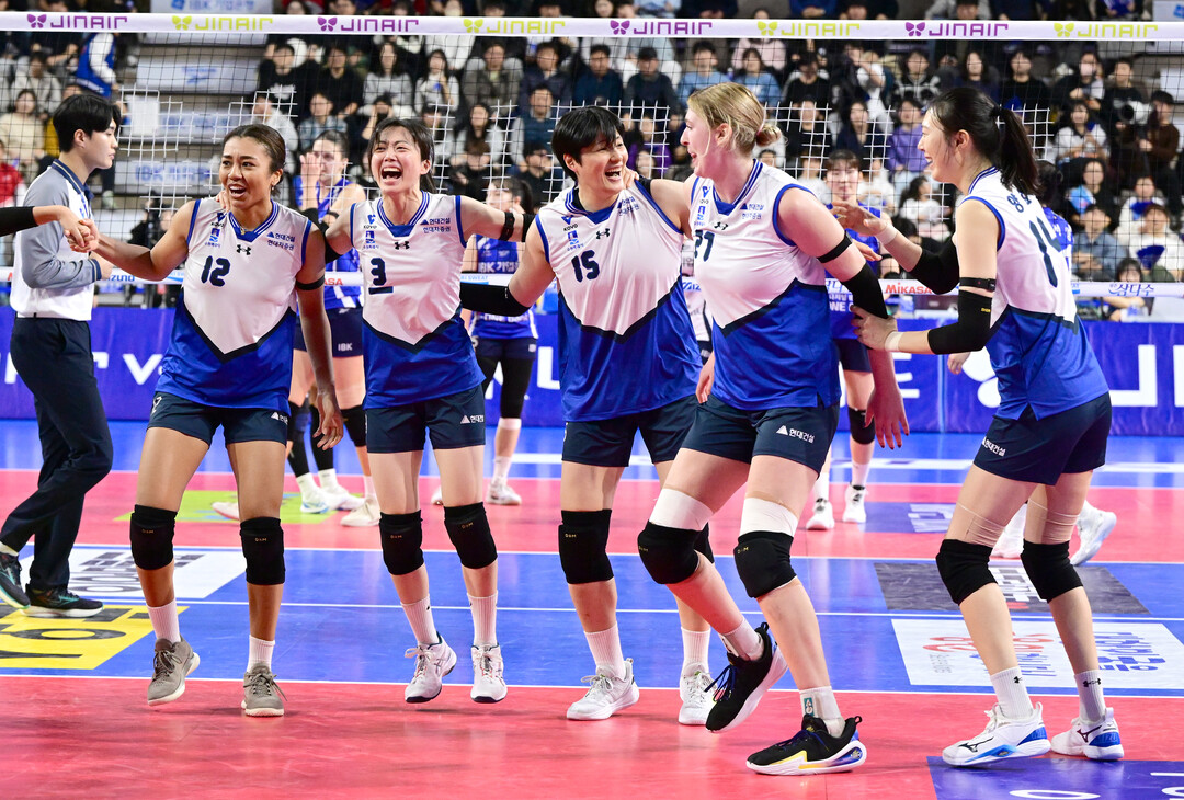 [더발리볼 = 유진형 기자] 현대건설이 22일 오후 경기도 화성실내체육관에서 열린 '진에어 2025~2026 V-리그' IBK기업은행과의 경기에서 승리한 뒤 기뻐하고 있다.