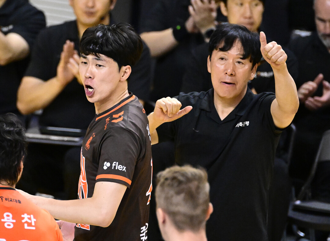[더발리볼 = 유진형 기자] OK저축은행 전광인이 30일 오후 경기도 의정부시 경민대학교에서 열린 '진에어 2025~2026 V-리그' KB손해보험과의 경기에서 신영철 감독과 함께 기뻐하고 있다.