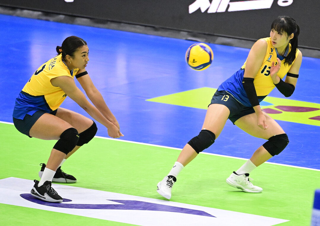 [더발리볼 = 유진형 기자] 현대건설 자스티스가 4일 오후 경기도 수원실내체육관에서 열린 '진에어 2025~2026 V-리그' IBK기업은행과의 경기에서 리시브를 하고 있다.