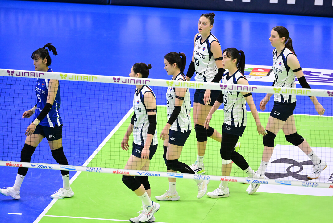 [더발리볼 = 유진형 기자] IBK기업은행이 4일 오후 경기도 수원실내체육관에서 열린 '진에어 2025~2026 V-리그' 현대건설과의 경기에서 패한 뒤 허탈해하고 있다.