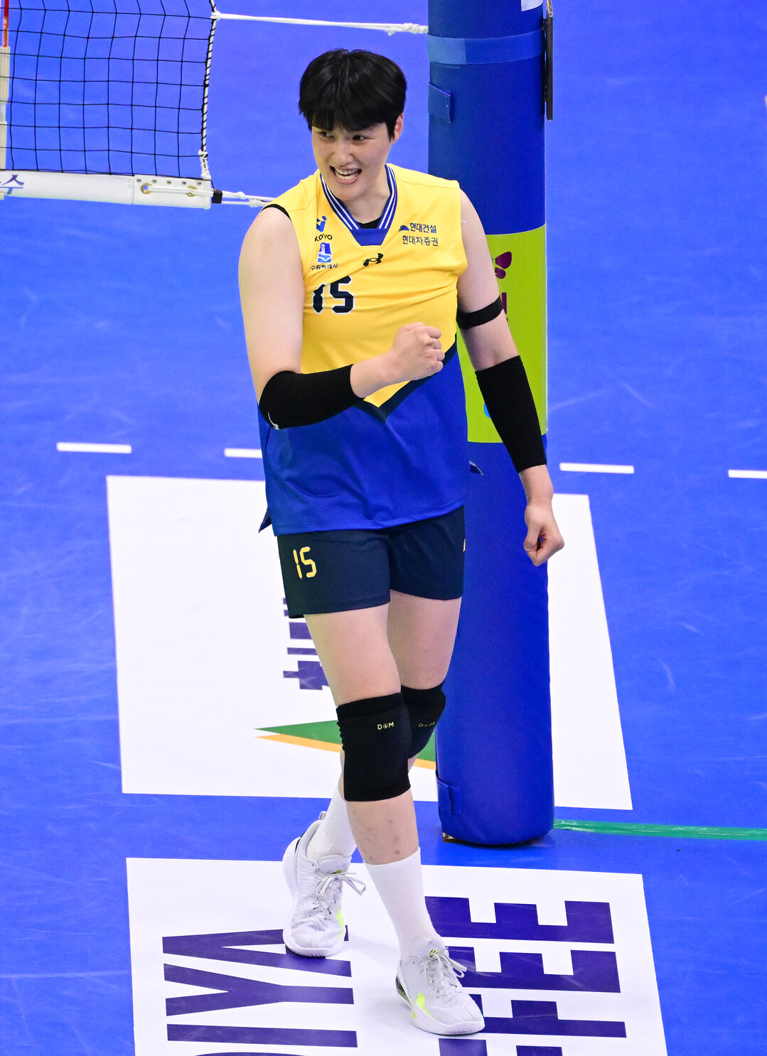 [더발리볼 = 유진형 기자] 현대건설 김희진이 4일 오후 경기도 수원실내체육관에서 열린 '진에어 2025~2026 V-리그' IBK기업은행과의 경기에서 기뻐하고 있다.