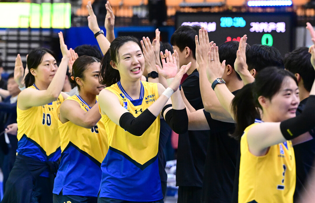 [더발리볼 = 유진형 기자] 현대건설 양효진이 4일 오후 경기도 수원실내체육관에서 열린 '진에어 2025~2026 V-리그' IBK기업은행과의 경기에서 승리한 뒤 기뻐하고 있다.